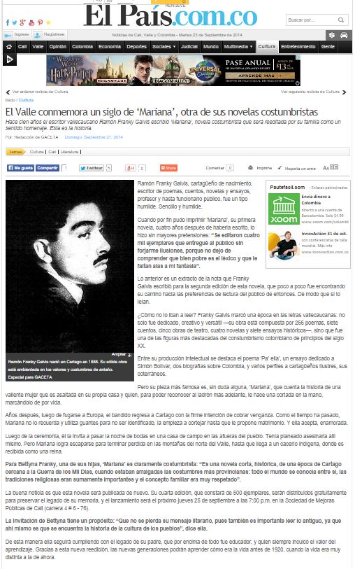 Ramón Franky Galvis en 1915 en Bogota recién escribió Mariana.
